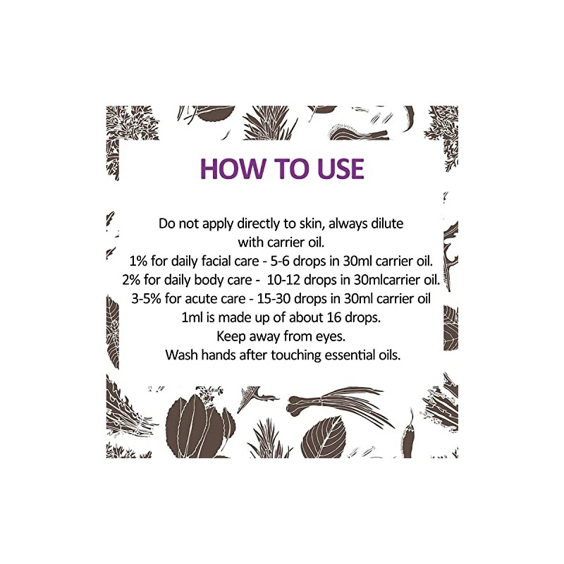 - For Skin & Hair Application - Do not apply directly to the skin, always dilute with a carrier oil. 1% for daily facial care, 5-6 drops in 30ml carrier oil. 2% for daily body care, 10-12 drops in 30ml carrier oil. 3-5% for acute care, 15-30 drops in 30ml carrier oil. 1ml is made up of about 16 drops.