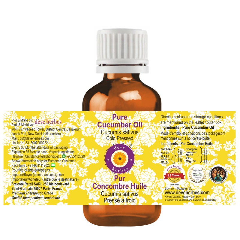 Deve Herbes Pure Cucumber Oil Cold Pressed. WE GUARANTEE: Highest Quality Pure, Natural & Undiluted Oils. If you are not satisfied, you can get a 100% refund even after using the product. Try it risk-free with No-Questions-Asked 100% Money-back Guarantee. ABOUT DEVE HERBES: dève herbes is a privately owned essential oil company specializing in sourcing finest natural essential oils from native crop regions around the globe. With largest range of essential & carrier oils in the world, dève herbes has more than a million highly satisfied customers in over 100 countries. Our oils are natural, pure, undiluted, with traceable origin, of highest quality & with 100% money back guarantee. Our range also includes Essential Oil Blends, Aroma Oils, Natural Herbs, Body Butters, Floral Waters and Waxes. Thanks for Shopping. Note: Best Before 36 months from date of Packaging mentioned on the box