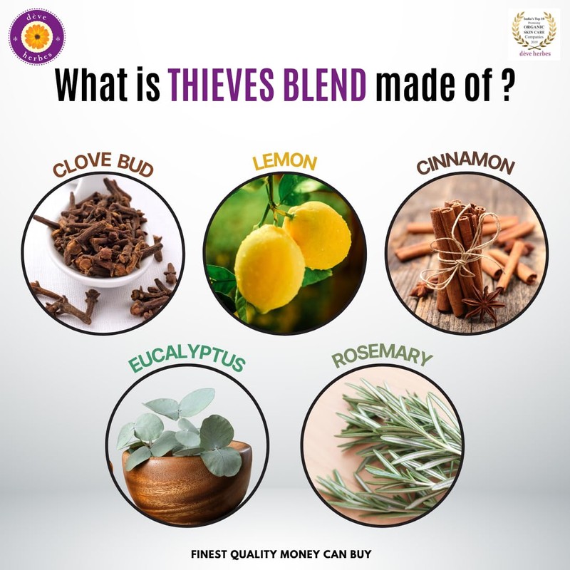 - MULTIPURPOSE BLEND: A powerful combination of Clove, Lemon, Cinnamon, Eucalyptus, and Rosemary oils, Almond Oil. Thieves is a versatile blend that can be used topically or aromatically.
