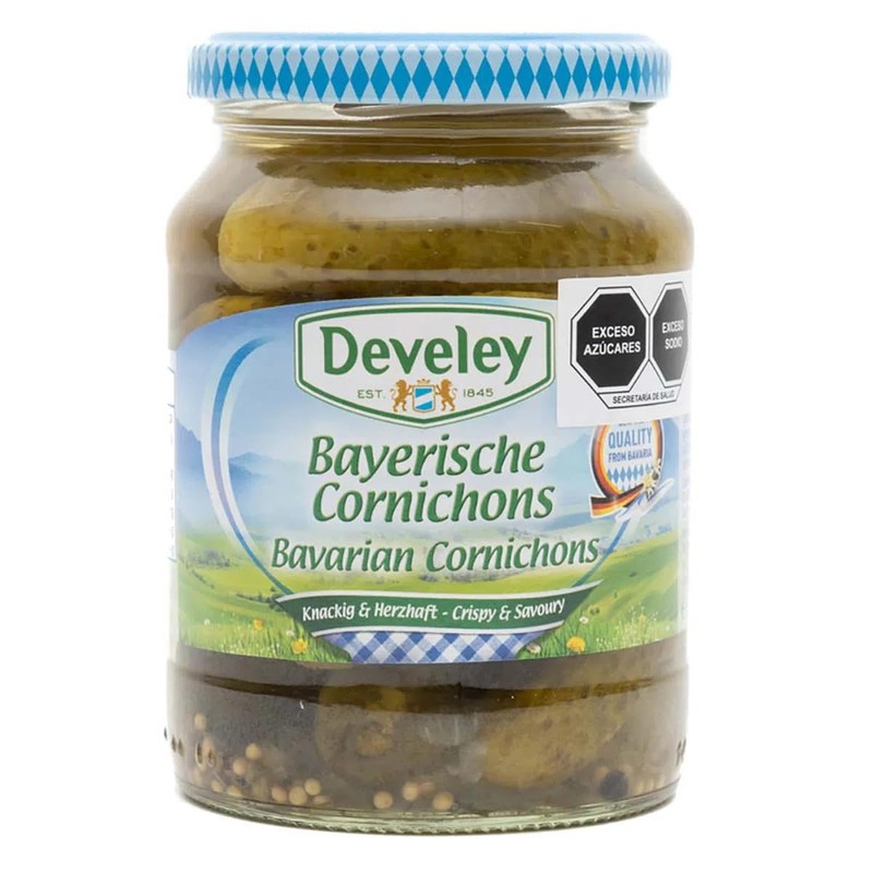 - Los Pepinillos en Vinagre (Cornichons) de Develey, en su presentación de 330 g, son pequeños pepinillos encurtidos en vinagre que aportan un sabor agridulce y una textura crujiente, ideales para acompañar una variedad de platillos. Perfectos para acompañar carnes frías, embutidos, sándwiches, hamburguesas, ensaladas y como aperitivo.