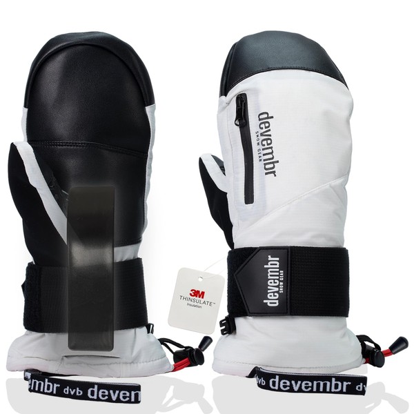 devembr Ski Mittens with Wrist Guards, Waterproof Snowboarding Mittens, White, L