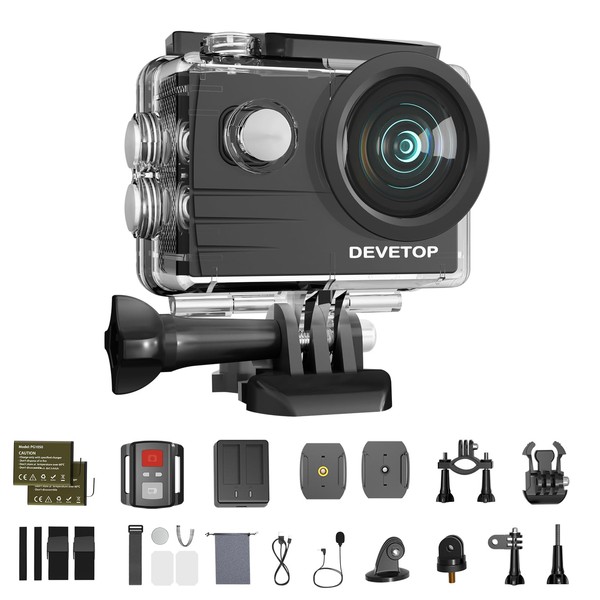 DEVETOP Glory60 Action Cam 4K/30FPS Unterwasserkamera 40M Wasserdicht 20MP WiFi mit Weitwinkel 170° externes Mikrofon Ultra HD Wireless Fernbedienung 2.4G 2x1050mAh Batterien und Zubehör