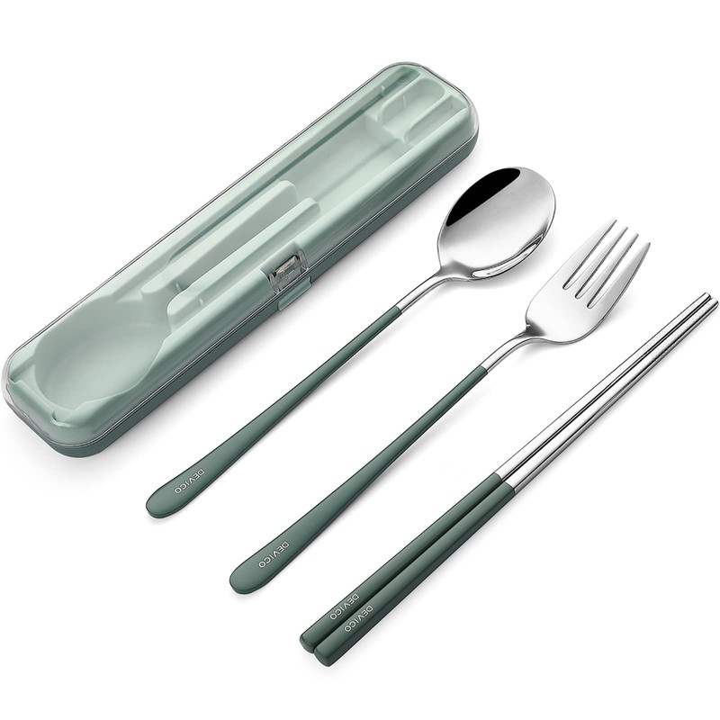 DEVICO Portable Utensils, Travel Reusable Silverware Flatware Set for Lunch, 18/8 Stainless Steel 4-Piece Camping Cutlery Include Fork Spoon Chopsticks with Case (Green)