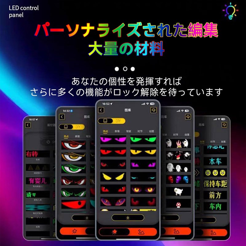 • 【Customizable DIY Function】Customize your text, pattern, doodling, and animation to create your own Devil Eyelights. With over 1600 colors to choose from, the LED screen panel dances to match the rhythm in music mode
