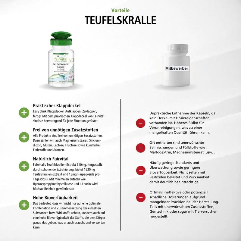 - ✔ fairvital German quality: daily dose: 3 capsules per day contain 1530 mg devil's claw extract, of which 18 mg harpagoside. High dose. Excellent value for money! Standardized to 1.2% harpagoside.