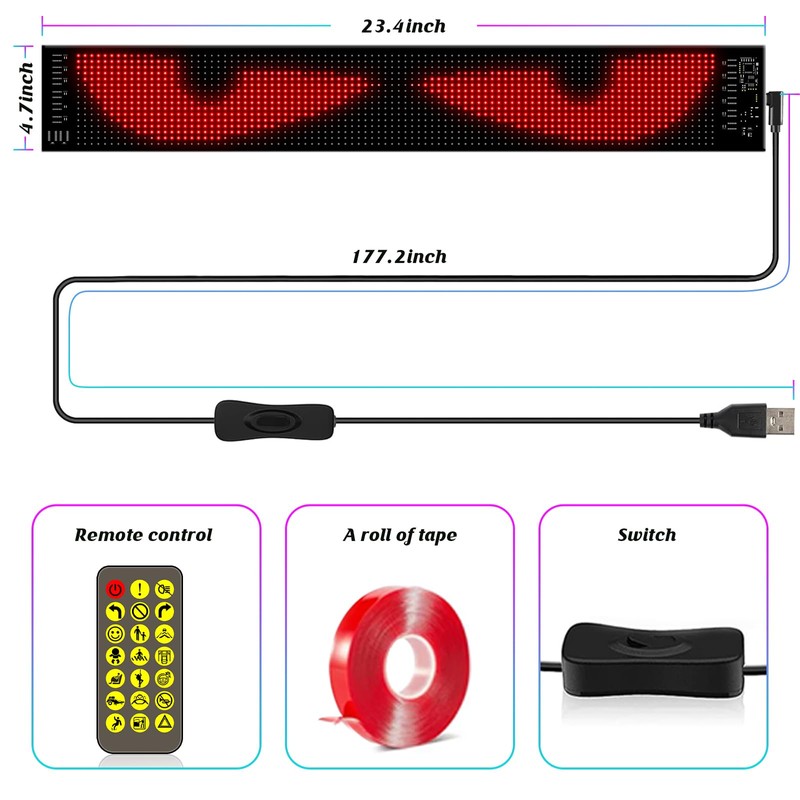- Easy Installation:Our programmable LED car logo comes equipped with high-quality, flexible LED arrays and user-friendly circuitry.Resolution: 96px x 20px, It features a durable IP68 waterproof adhesive polymer coating, allowing it to seamlessly adhere to any surface and be easily removed without leaving a trace. Just plug in the included USB cable, and you're ready to shine—it truly is plug-and-play!