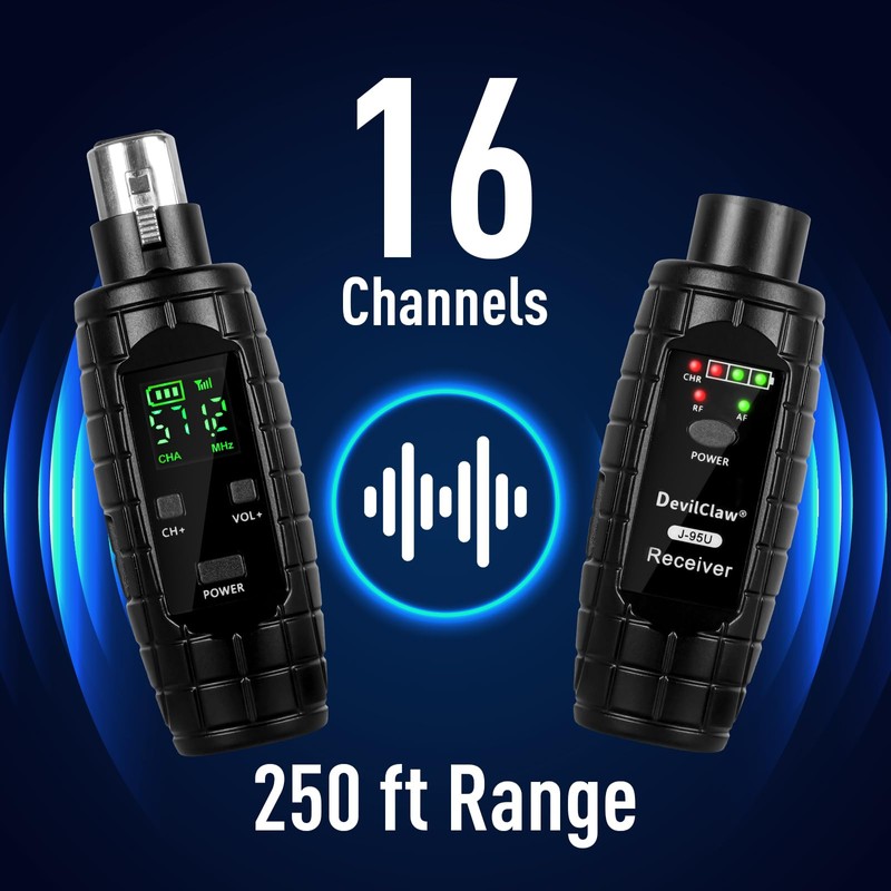DevilClaw UHF Wireless Microphone System,Transmitter and Receiver XLR Adapter for Dynamic Microphones, Guitar, Mixer, PA System, 16 Adjustable Frequencies, USB Charge, 250ft Range
