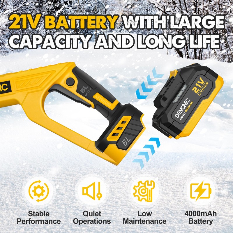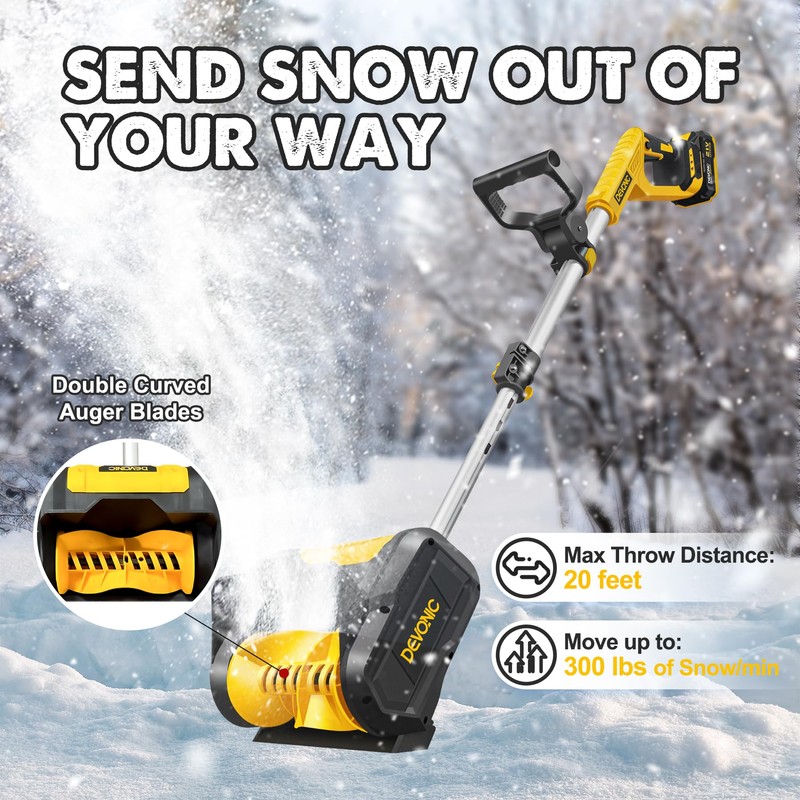 - BATTERY OPERATED,CORDLESS DESIGN: DEVONIC cordless snow shovel offer hassle-free use with no cords or gas required. Equipped with powerful 20-volt battery for gas-like performance. It clears a 13.5-inch wide and 6.5-inch deep path, capable of throwing snow up to 20 feet.this battery operated snow shovel perfectly suited for use in residential areas