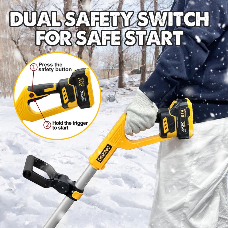 - ERGONOMIC FEATURES: This compact cordless snow shovel weighs only 16.8 pounds, making it lightweight and comfortable to use.the snow thrower features an adjustable ergonomic handle with protection switch design, allowing you to enjoy the scenery and fun of the snowy season while comfortably and efficiently clearing snow