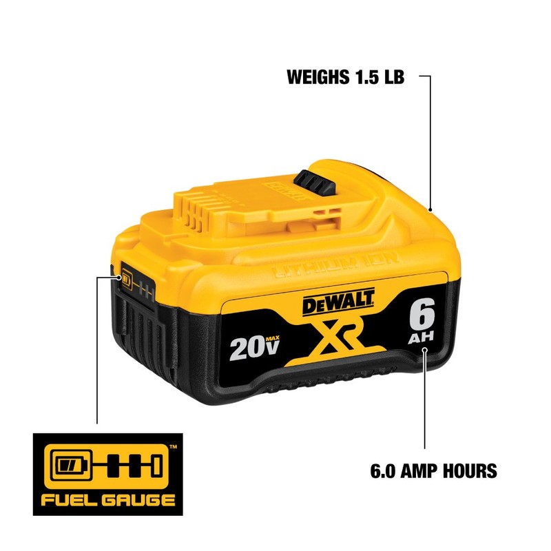 - Premium 6.0Ah DEWALT 20V battery provides 2 times the capacity of standard Battery Pack (DCB200)