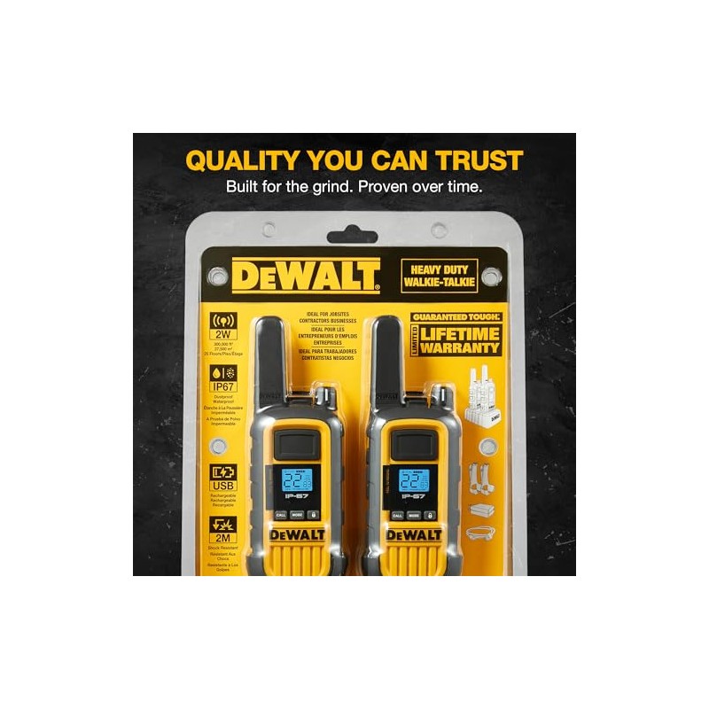 DEWALT heavy-duty walkie talkies are ideal for jobsites, contractors, and businesses. These reliable, feature-rich radios have ultra-clear long-distance reception and rugged durability that stands up to the elements. Stay in touch while on the job with secure, versatile talk that's guaranteed tough, with convenient accessories that power growing teams.