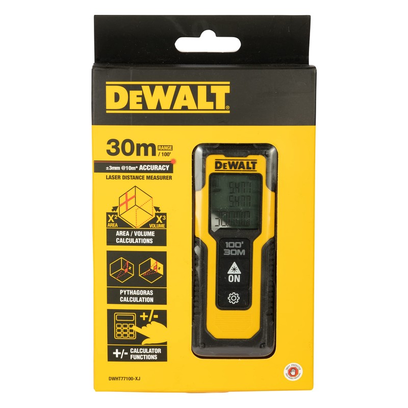 Dewalt Laser Distance Meter DWHT77100 (0.2 to 30 m Range, Laser Class 2, Measurement Tolerance: +/- 3 mm / 10 m, Length, Areas, Volume & Pythagoras Measurements, Easy Operation)