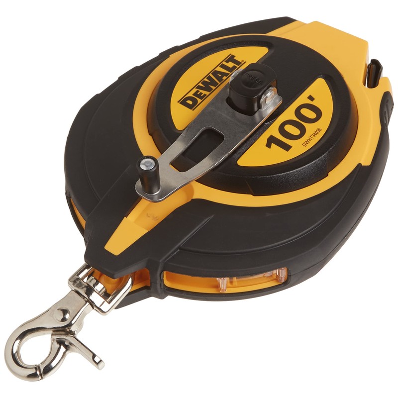 The DEWALT 100 Foot Long tape has a 5:1 gear ratio for 5X faster blade rewind. It has a rust-resistant coating for prolongs blade. The blade-lock securely holds blade in position while measuring and it has a blade release for easy pullout. It has a spring loaded carabineer attachment for easy transportation. It also has a dirt removal window to easily allow dust to be removed from the tool