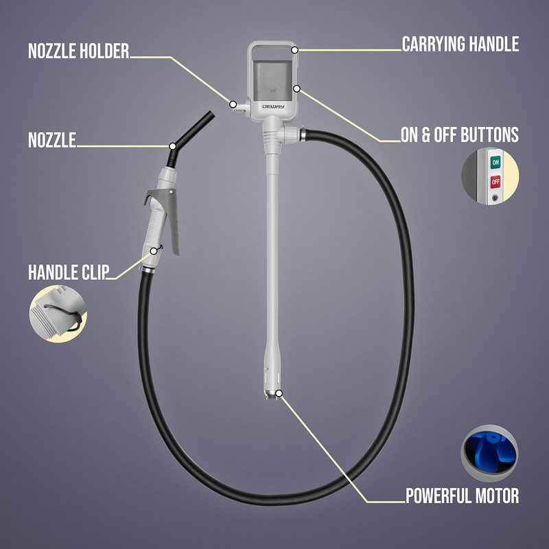 - STOP LIFTING HEAVY CANS | Flexible System Finally Gives Your Back a Break | Operate the Pump with One Hand or 100% Hands-Free—No Heavy Lifting! | Extra Long Transfer & Suction Tube Easily Reaches Inside High Cans, Big Water Jugs & Other Large Tanks, While the Oversized Transfer Hose Provides Further Length & Reach