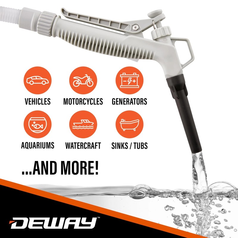 Plug in or go completely portable with the DeWay Gasoline Transfer Pump. Our latest fuel-transfer series features four newly redesigned models for siphoning and moving gasoline, kerosene, diesel fuel, acids, dirty aquarium water, and other non-potable liquids—but this time, we’ve included a few supercharged features and convenient extras to make operation even more versatile than before. Whether you’re in need of a basic fluid transfer pump for filling up vehicles, the kind of precise trigger control you get at the gas station, the DeWay Gas Pump Transfer Device saves you countless time and hassle. Every syphon pump for gas is equipped with an extended 51” discharge hose with greater incline capacity; ample 19” intake tube for pulling liquid out of almost any size container; a built-in nozzle hook for tidy storage; simple on/off control panel; multiple adapters for compatibility with various gas cans; a drawstring storage bag; and a dual-powered motor that runs reliably on 4 AA batteries or via USB-C cable (included). Turn on to experience serious siphoning action up to 3.8 gallons per minute—that’s faster and far more efficient than other comparable portable pumps! So, why waste money and energy transferring liquids the old-fashioned way? Save your back by adding a DeWay Gas Can Portable Fuel Pump to your cart today!
