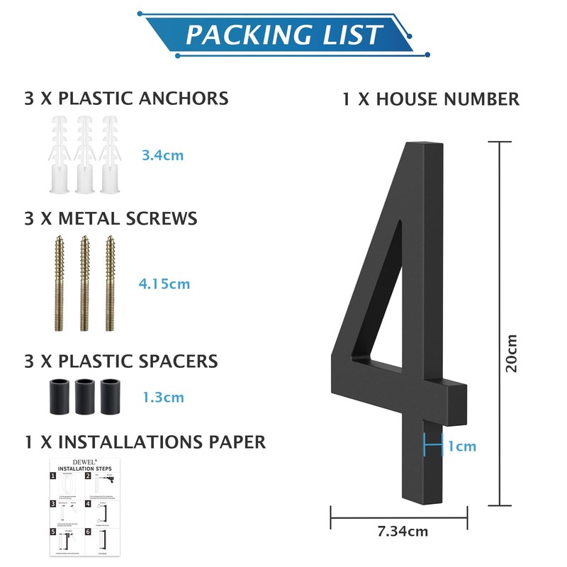 DEWEL Acrylic House Numbers, 20.3 cm / 8 Inch Large House Number, 3D Effect Door Number in Modern Style, Weatherproof, for Outdoors, Door, Mailbox, with Screws (Black, Number 4)
