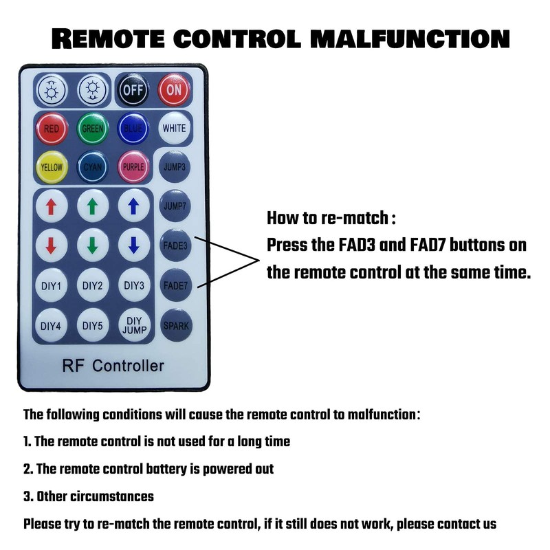 - If the remote control is not used for a long time or after replacing the battery, the matching will be disconnected. If the remote control cannot be used, please try re-match it by pressing the FAD3 and FAD7 buttons on the remote control at the same time. If it still cannot be used, please contact us.