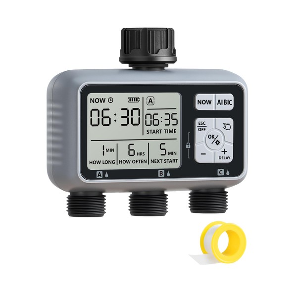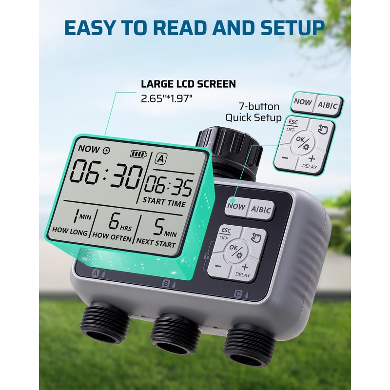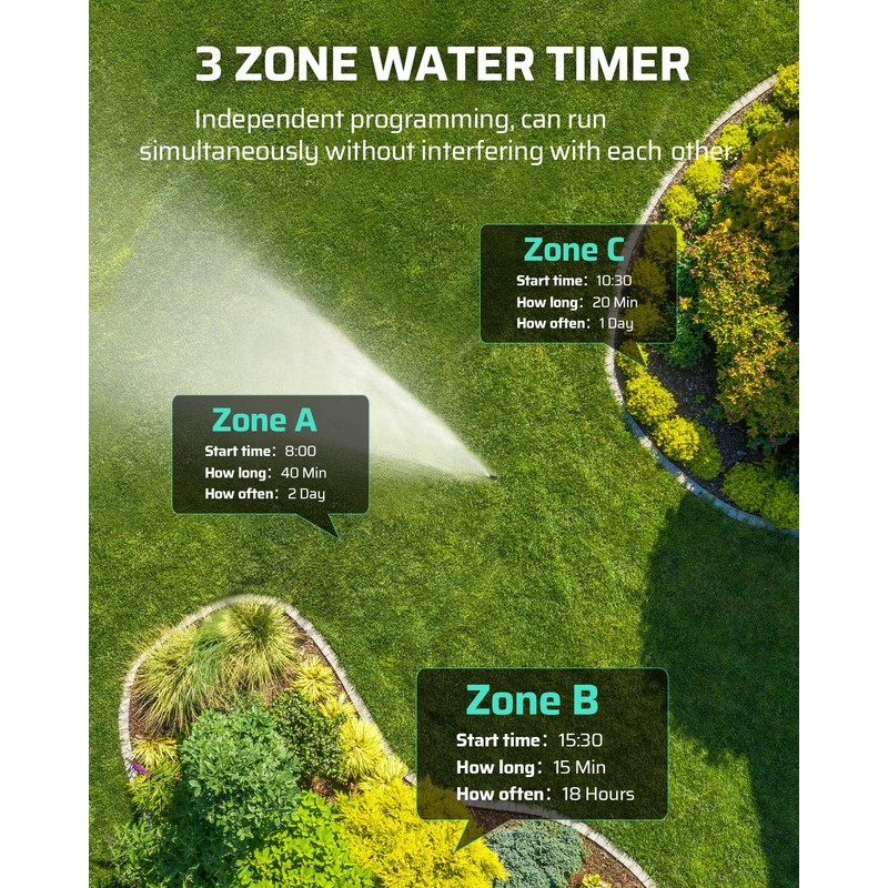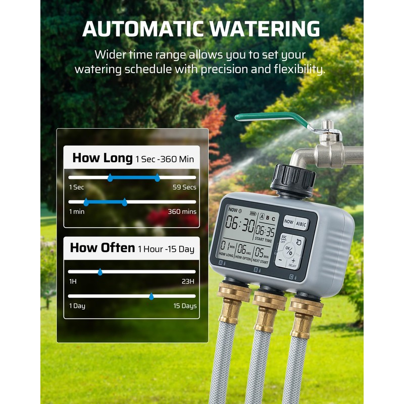 - [3 Independent Zones] Our faucet timer offers individual control over 3 zones (A, B, C), enabling tailored adjustments for start times, watering durations (1 second to 360 minutes), and watering frequencies (every 1 hour to 15 days); ensures optimal watering schedules for gardens, yards and lawns