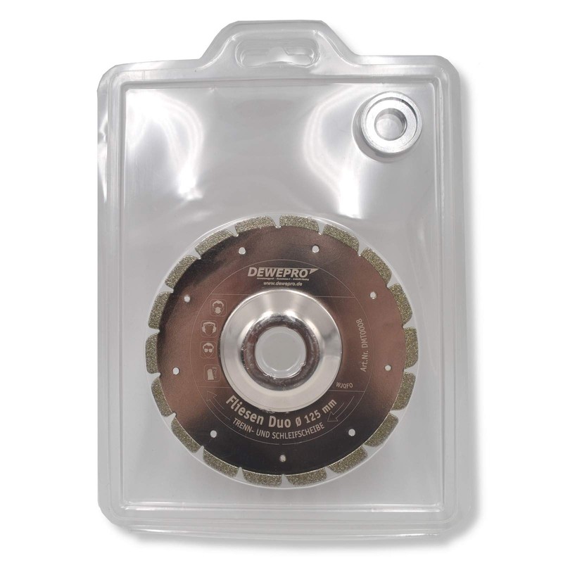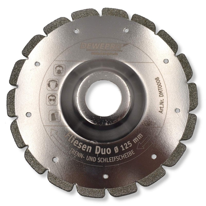 - The DEWEPRO diamond cutting and grinding wheel diameter 125 mm tiles Duo is an indispensable tool for any craft project that requires precision and versatility. This diamond disc combines two functions in one - cutting and grinding - thus offering exceptional flexibility when working on tiles, ceramics and thin natural stone slabs. With its optimal diameter and robust construction, it is the ideal choice for professional tradesmen and ambitious DIY enthusiasts.