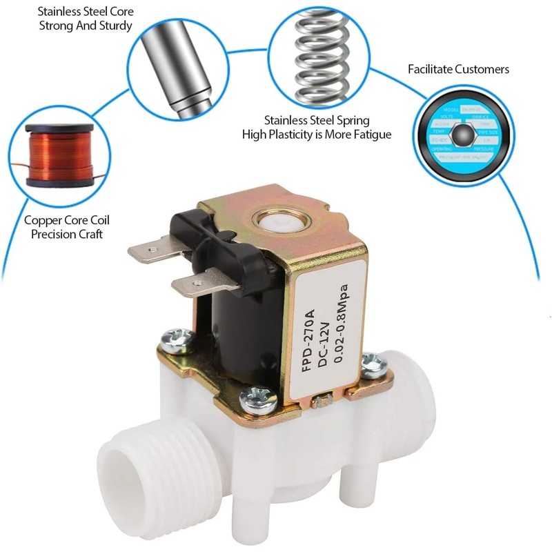 - 【Solenoid Valve】: Model: FPD-270A; Type: NC/Normally Closed; Thread: G1/2; Rated Voltage: DC12V; Rated Current: 12V-300mA; Insulation Class: E Insulation Class; Applicable Liquid Temperature: 0-55℃; Applicable Water Pressure: 0.02-0.8MPA; Size: 6.5*3.3* 5.5 cm; Weight: approx. 100 g.