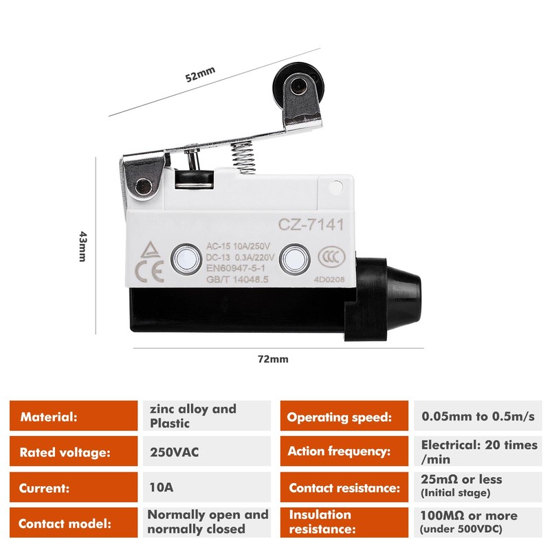 DewinLVD Corsa Limit Switch CZ-7141 Horizontal Limit Switch Long Roller Lever Micro Switch with Automatic Reset 10A 250 VAC