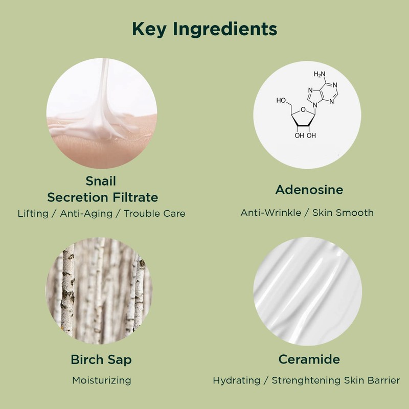 Formulated with snail mucus filtrate to heal and boost skin resilience hydrates, revitalizes, and energizes skin softens and smoothens coarse texture minimizes the appearance of fine lines, wrinkles, and acne scars protects against environmental damage lightweight texture is quickly absorbed for a non-greasy feel 3-free system means it contains no paraben, alcohol, and artificial color
