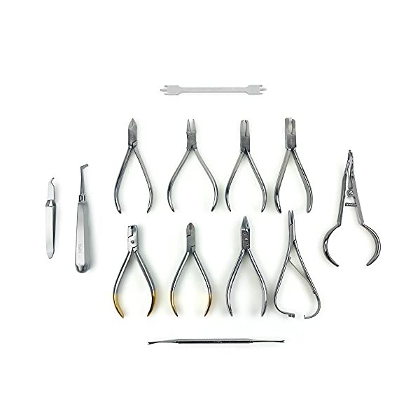 - One of each Bird Beak Pliers, Three Prong Bending Aderer Pliers, Hard Wire Cutter, Ligature Director, Light Wire Cutter, Distal End Cutter Safety Hold, Bracket Holder Tweezers, Height Gauge, Band Pusher, S Band Remover Pliers, Mathieu Pliers, Bracket Remover Pliers, Separating Placing Pliers