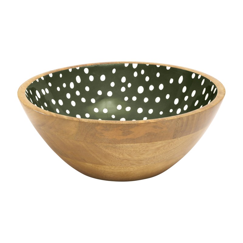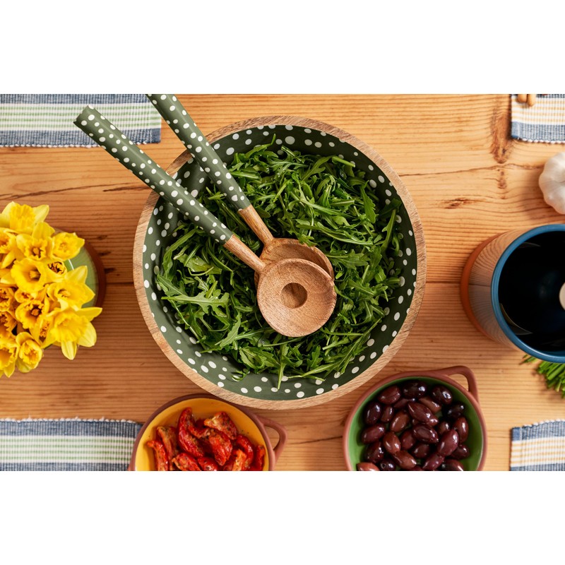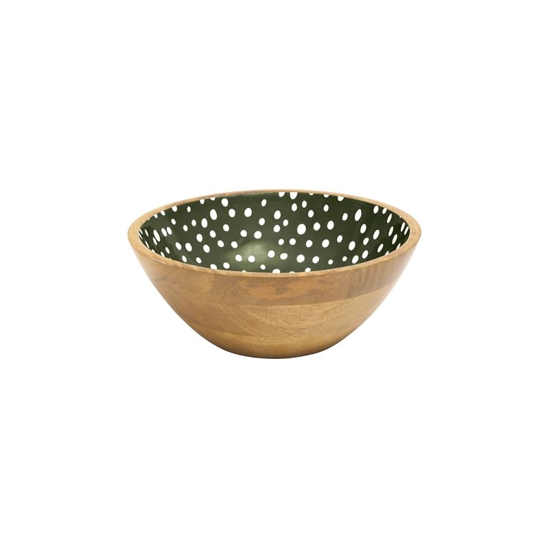 • Serve your salad in style with this eco-friendly mango wood salad bowl. Enamelled with an Olive Green hand finished spotted design