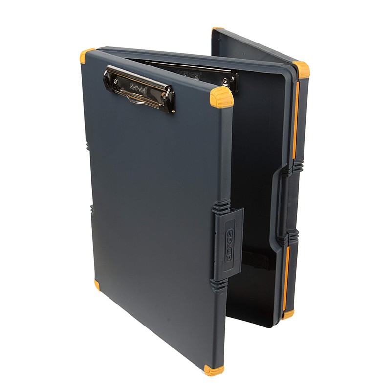 - Front case features a smooth writing surface, metal clip and large compartment for notepads, electronic tablets