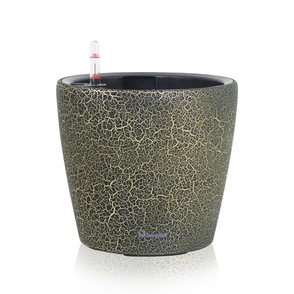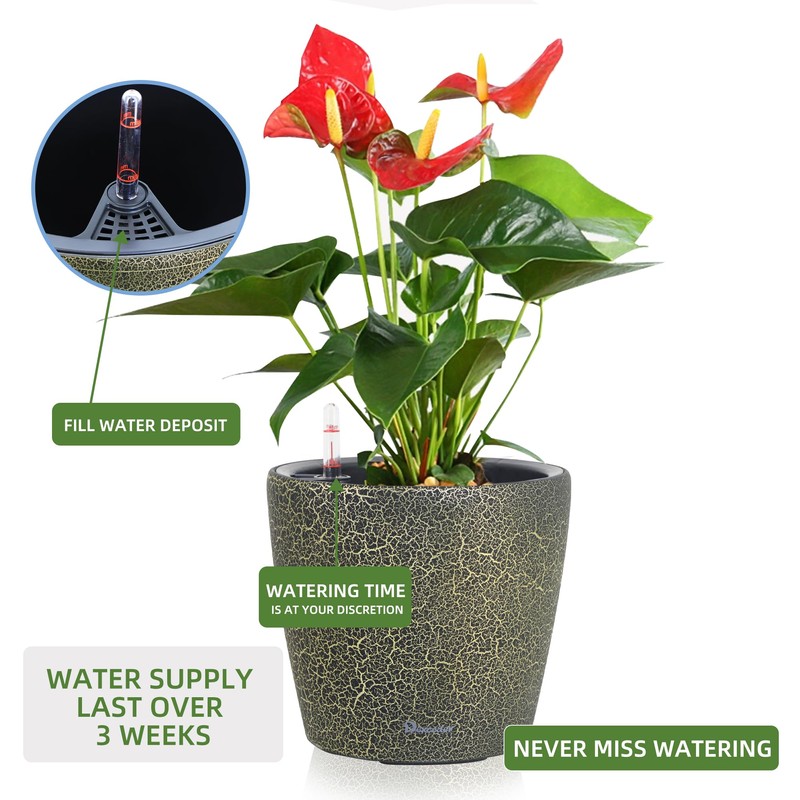 Dexceder 11x10 Inches Self Watering Planter Indoor Outdoor, Inner Pot Design, Thickened Table Flower Plant Pot with Water Level Indicator (Black Gold Crackle)