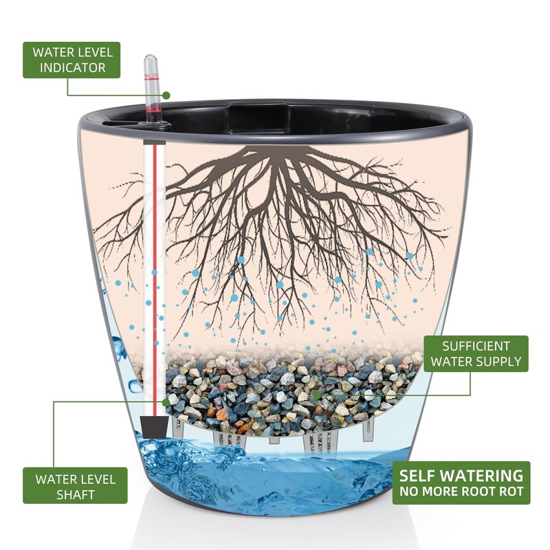 • SELF WATERING & NO MORE ROOT ROT - The smart unique sub-irrigation system is one of the most appealing aspects among all Dexceder planters. The easy-to-use separated integrated water reservoir or catcher- keeps your soil well aerated and automatic supplies plants with the right amount of ongoing moist air & nutrition for optimal growth. The insert indicator shows you the exact time to water again. The full water supply period can single-handedly last over 3 weeks based on different live plants