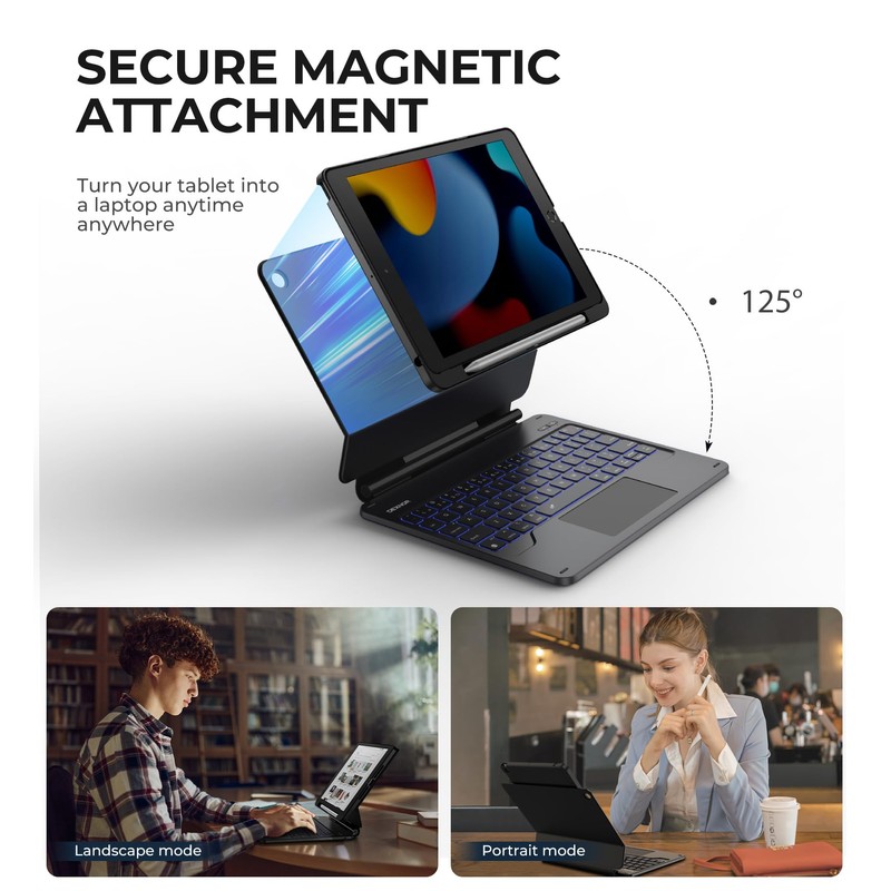 - EASY-SET MAGNETIC STANDThe durable aluminum alloy hinge guarantees a sturdy magnetic connection, instantly transforming your tablet into a laptop. Enjoy a floating cantilever stand with customizable angles tailored for typing, reading, and immersive viewing. It's a perfect companion for travel, work, study and versatile daily use.