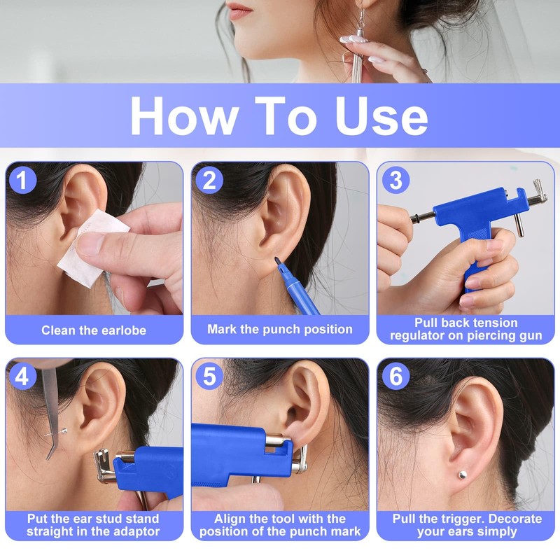 - Quick and Easy to PierceThe at home piercing kit provides a quick and simple way to pierce earholes, gently press the trigger, and the ear piercing will be finished nicely on your ear very fast. (Warm Notice: Make sure to secure the piercing studs straight in the earring holder slot, so that you will get a painless and accurate piercing hole)