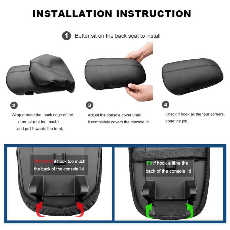 • 【EASY TO INSTALL】No any other tools needed, ①just wrap around the front and back edge of the armrest , ② then adjust it from corner to corner ③ smooth the cover and done the job. The center console cover doesn't impeded the use of the center console or the lifting of the lid.