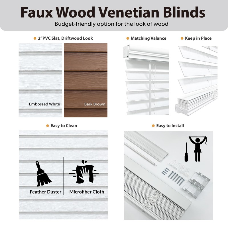 - Elegant Wood Grain Look: These window blinds, with a timeless wood grain appearance, exude premium quality with 2-inch slats and a color-matching valance, perfect for a stylish interior touch.