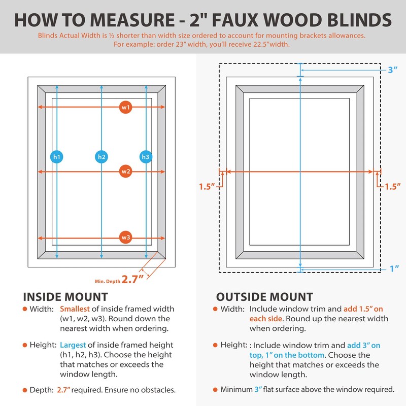 - Blinds actual width will arrive ½" narrower for a snug fit inside your window, allowing for end caps and hardware. For an outside mount, just order ½" wider for better covering.