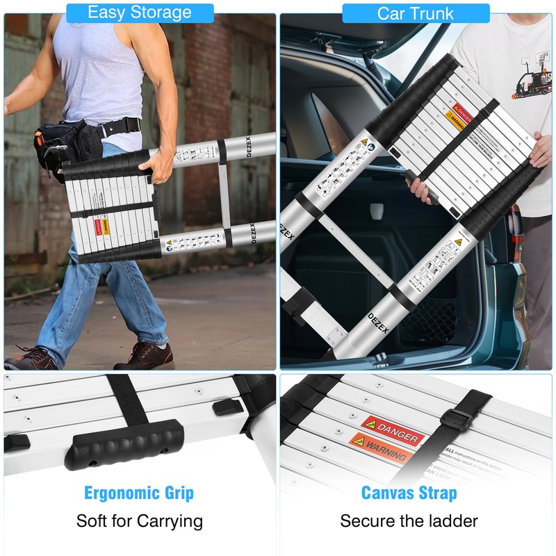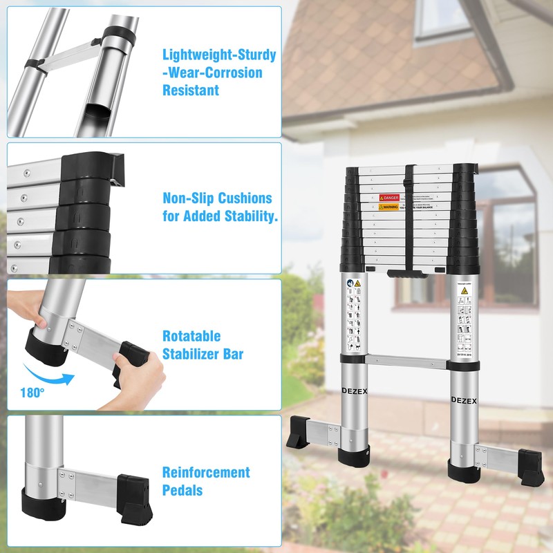 - [ DEZEX TELESCOPING LADDERS ] This 12.5 FT versatile ladder is perfect for both home and professional use. With a high load capacity of 330 lbs, it ensures stability and safety for your tasks.Aluminum alloy material is more lightweight and easy to carry, suitable for a variety of different occasions.