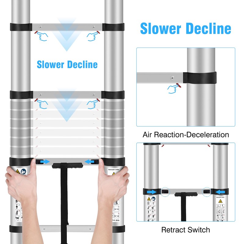 - [ ONE-BUTTON RETRACTION ] Say goodbye to struggling with complicated ladders. This telescoping ladder features a convenient one-button retraction mechanism for easy and quick setup and storage.Press the thumb button and the first step of the ladder automatically descends at a smooth and slow speed, followed by the other steps at a gentle pace. It ensures that your fingers will not be squeezed, safe and convenient.