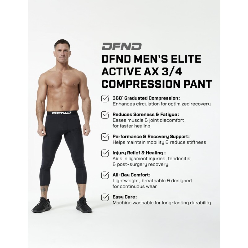 DFND Men's Elite Active Ax 3/4 Compression Pants – Graduated Compression for Recovery & Performance, Reduces Fatigue & Soreness, Made in USA - Black - Large