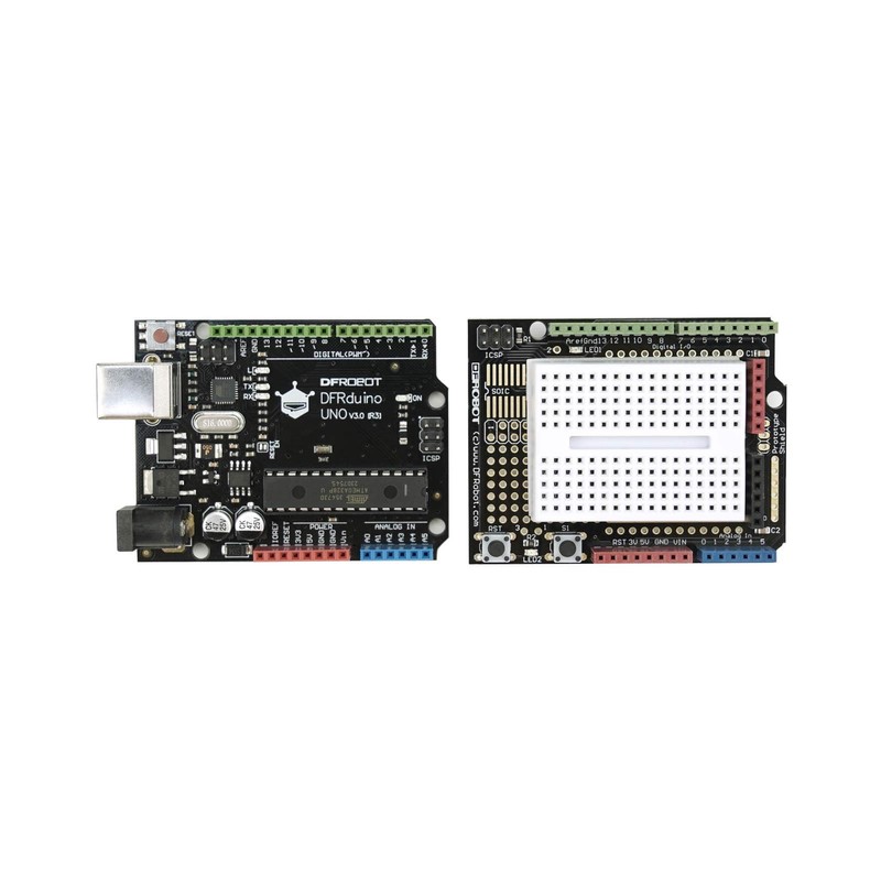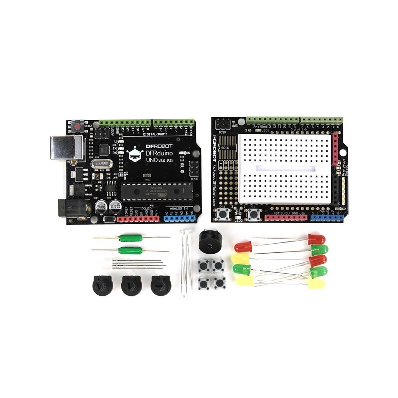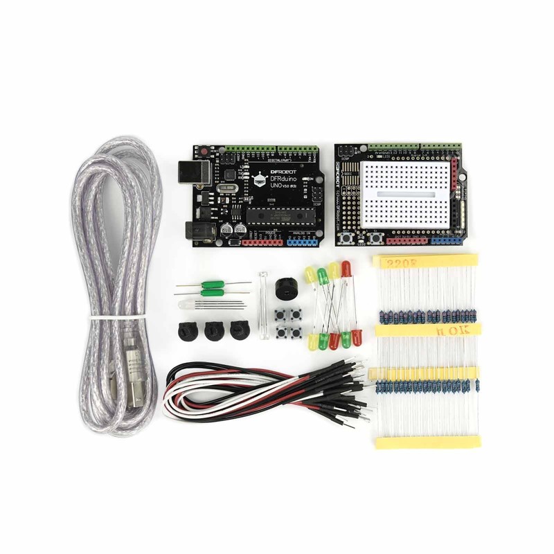 - DFRobot Beginner-Friendly Starter Kit for Arduino comes with basic components required, including UNO R3 control board with USB Cable, resistors, LED, jumper cables, sensors, buzzer and potentiometer.
