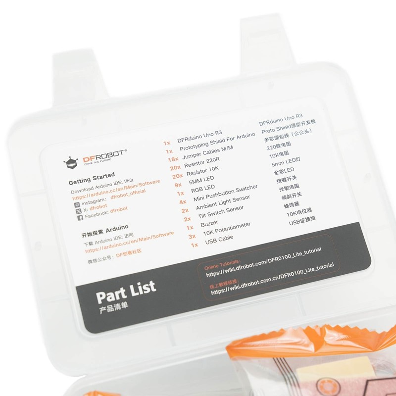 Equipped with high-quality components, including LEDs, resistors, push buttons, potentiometers, buzzers, tilt switches, and light sensors, this beginner kit for Arduino ensures a comprehensive hands-on learning experience. Whether you're a student, educator, or hobbyist, the DFRobot Beginner Kit is your gateway to mastering electronics and programming.
