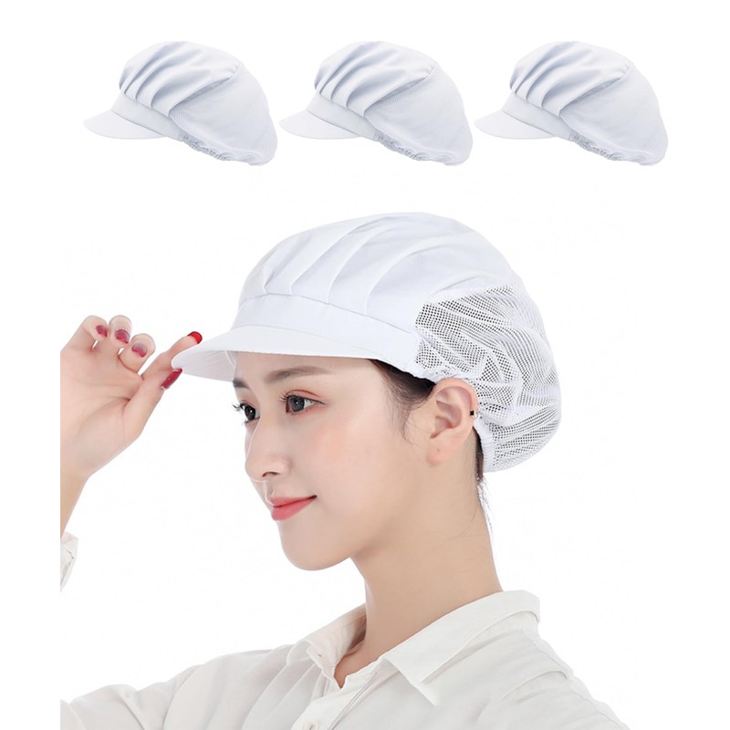 DFsucces Sanitary Cap, Set of 3, For Adults, Sanitary Hat, Lunch Cap, Kitchen Hat, Cooking Hat, Half Mesh, Semi-Fabric, Breathable, Net Hat, Unisex, White (Partial mesh fabric)
