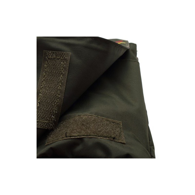 - Includes several compartments, one main zip closed, and another closed front flap and Velcro