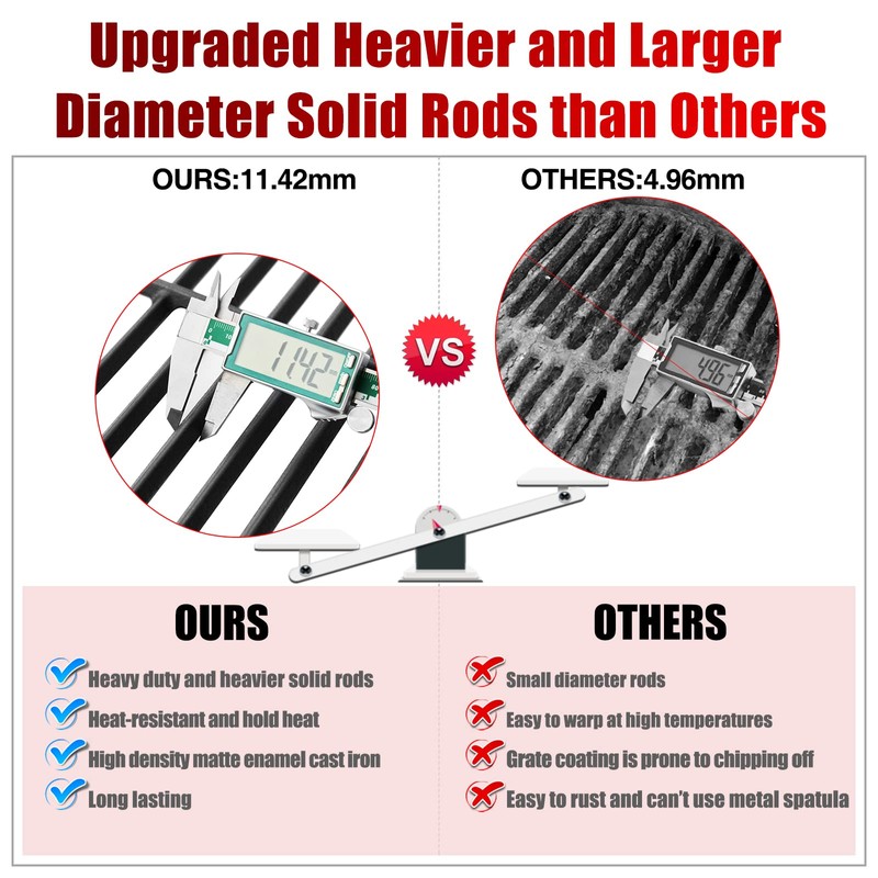 - ✅【UPGRADED MORE HEAVIER, SMALLER CLEARANCE AND LARGER DIAMETER SOLID RODS】 You will get the dyna-glo grill replacement parts grill grates that are made of matte enamel cast iron. dynaglo grates will last for many years if it's taken care of. ✅【HIGH HEAT RETENTION AND COOK FOOD FAST, DELIVERS EVEN HEAT DISTRIBUTION】 Heavy duty and more durable than others. perfect for searing and locking. ✅ Not like the porcelain coating grate that the coating chips or cracks over time.