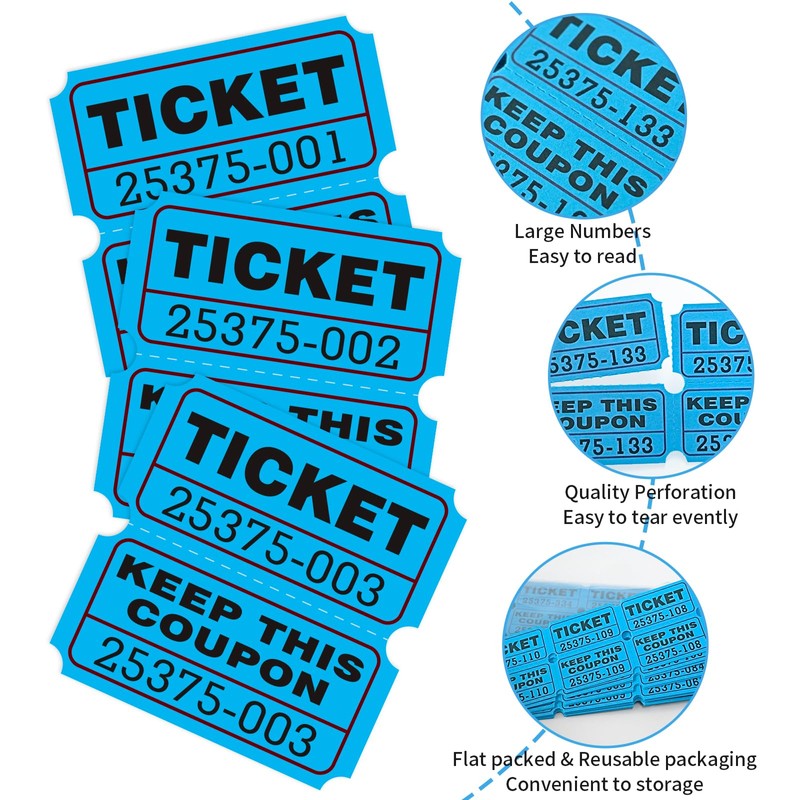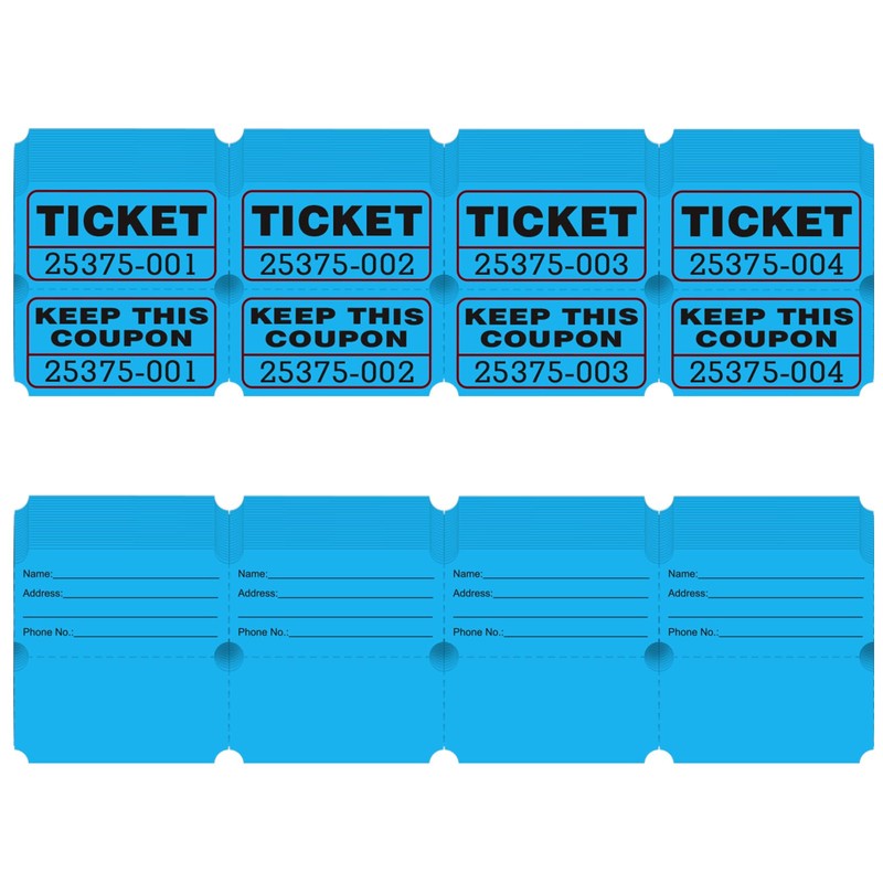 • The blue colored raffle tickets are consecutively numbered and perforated, making it easy to tear off multiple tickets at once. The large numbers are easy to read and there are duplicate numbers for tracking purposes.