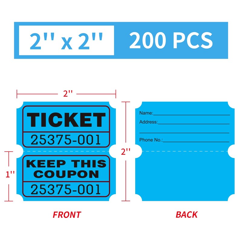 Each pack contains 200 2-part tickets, flat packed for easy storage and organization. These double stub raffle tickets are 2x2 inches in size and can be easily divided into 2 X 1 inch halves.