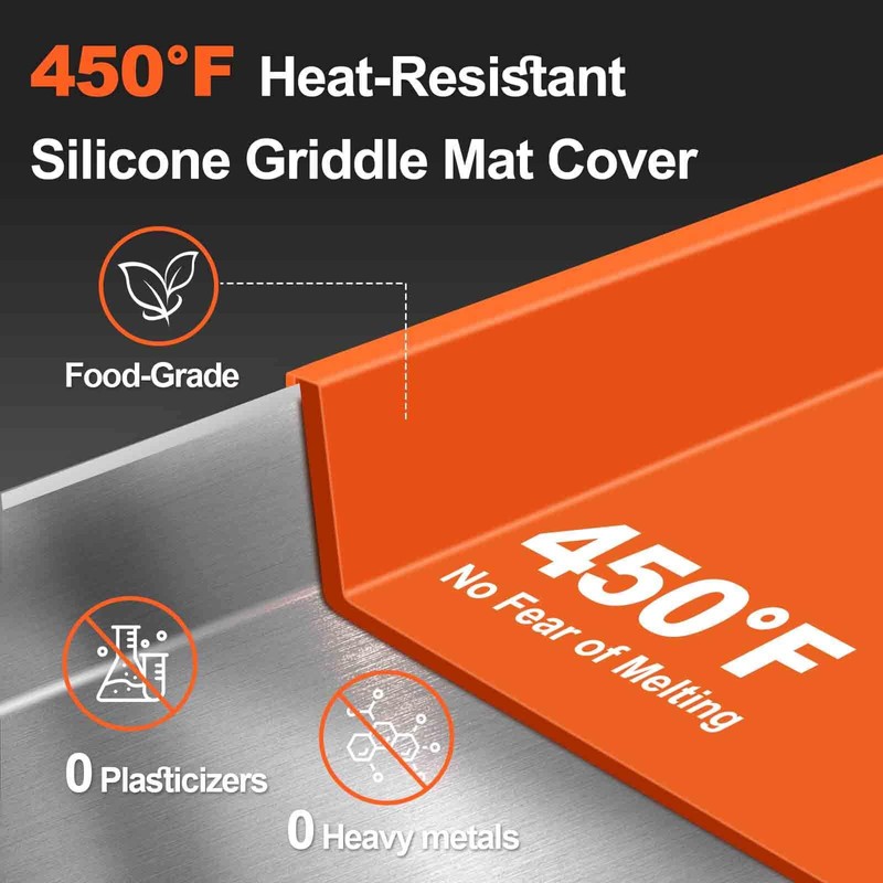 - 【Premium Food Grade Silicone Material】The silicone griddle cover is made of 100% high-quality food-grade silicone, thickened texture design, durable, flexible, foldable for storage and reuse, Note: The Grill Mat cannot be used directly when grilling, the high temperature will melt the silicone griddle mat.