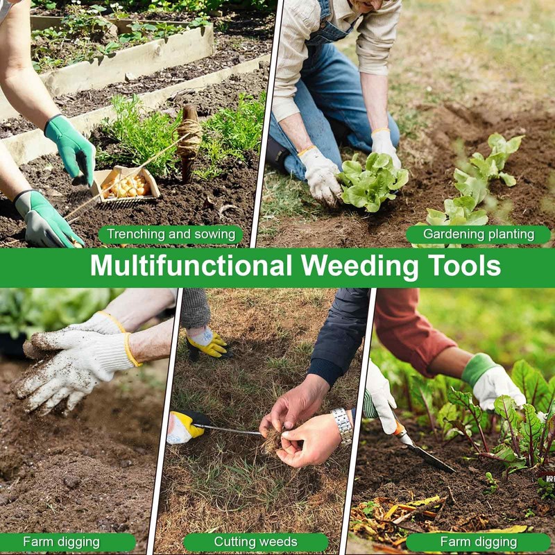 - 3-in-1 weed control kit: includes 3 robust tools: L-shaped gap scraper (32.5 cm) for surface cleaning, 4-prong hoe (32 cm) for loosening and digging, and Y-shaped dandelion digging tool (31 cm) for deep roots, suitable for comprehensive weed control