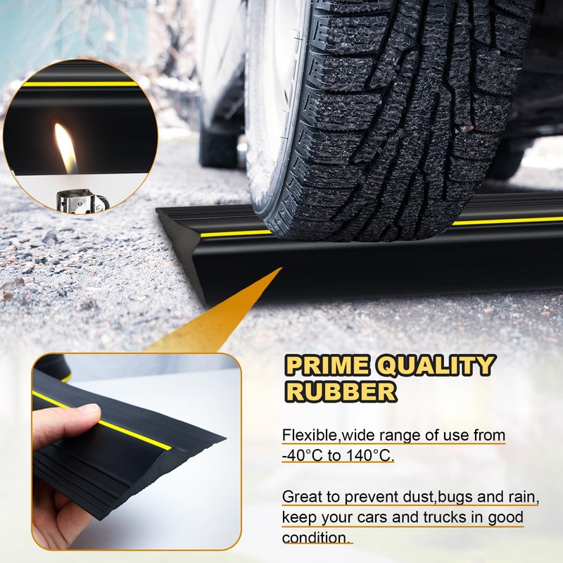 This garage door threshold seal is made from long-lasting,flexible rubber, designed to withstand extreme weather and daily car use. It serves as an effective barrier, keeping water, drafts, dirt, and debris out of your garage. Perfect for improving home preparedness, the seal helps maintain a clean and dry space while reducing exposure to dust and exterior elements. Its bright yellow strip enhances visibility for safety, while the non-slip ridges add extra protection. Easy to install and customizable, the weather stripping can be trimmed to fit doors