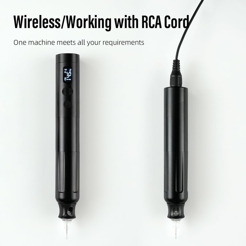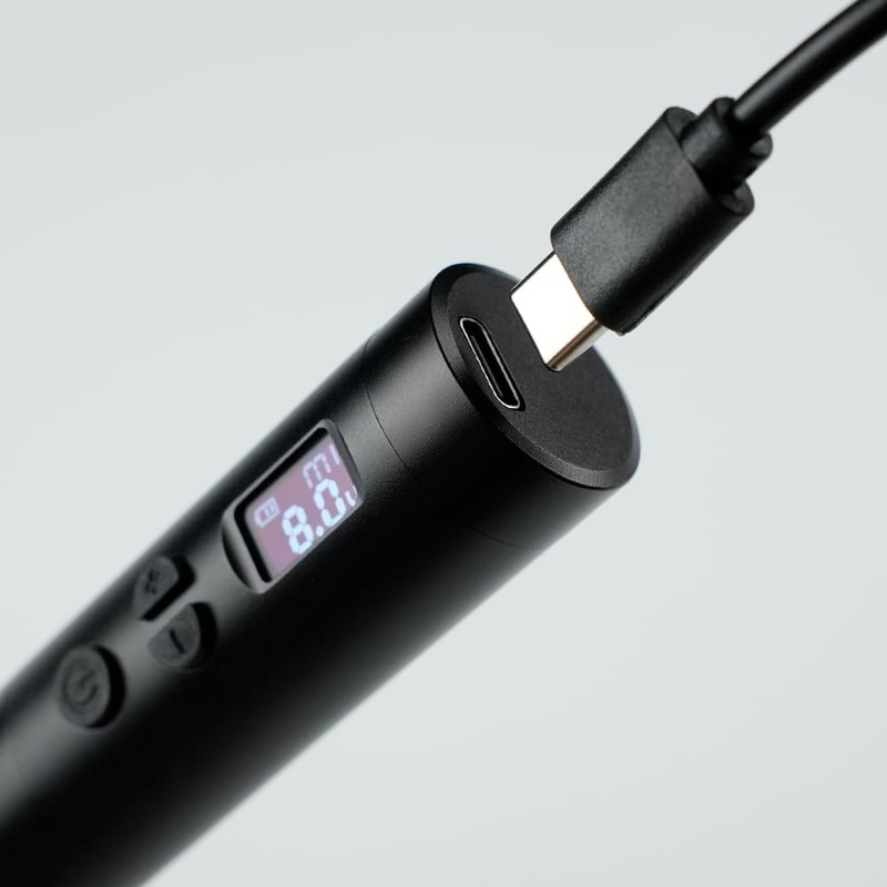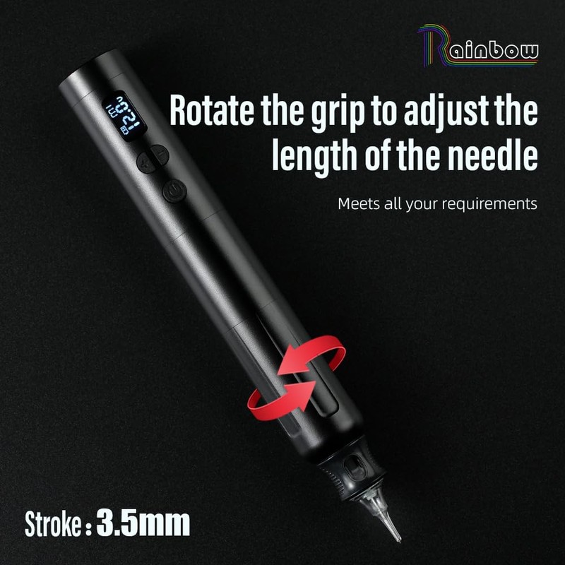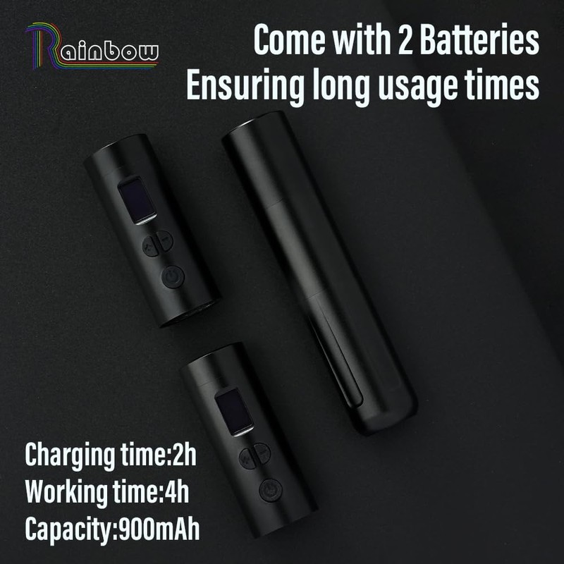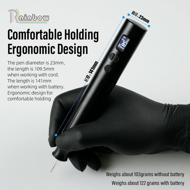 The new DGT Rainbow tattoo pen, powered by a coreless motor, combines strength with precision. Featuring an OLED screen, it requires a 5V/1A charging voltage and includes x2 900mAh battery for extended usage and x1 RCA Machine cord. Crafted from high-quality aviation-grade aluminum, this durable and slim pen withstands extensive use. Ideal for tattoos, microblading, and scalp micropigmentation, it offers easy operation with superior performance, safety, and stability.